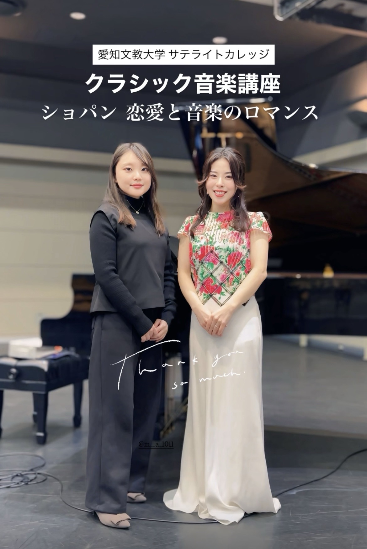 ショパン講座 投稿日 2026年2月8日 更新日 2026年3月10日 著者 のだみピアノ教室 カテゴリー ブログ カテゴリー 演奏会について 2/8 愛知文教大学サテライトカレッジにピアノソロで登壇させていただきました。 ショパンの恋愛を主軸にさまざまな曲に触れました🎹ショパンは本当にお伝えしたいことが多くて…本当人間らしいなと☺️野中先生とも盛り上がりました🎶 たくさん勉強しました。 現役の加納高校音楽科生さんが来てくださいました。 またどこかで取り上げたいテーマです。🎹雪の中、寒い中、皆様ありがとうございました☃️暖かくしてくださいね🧣